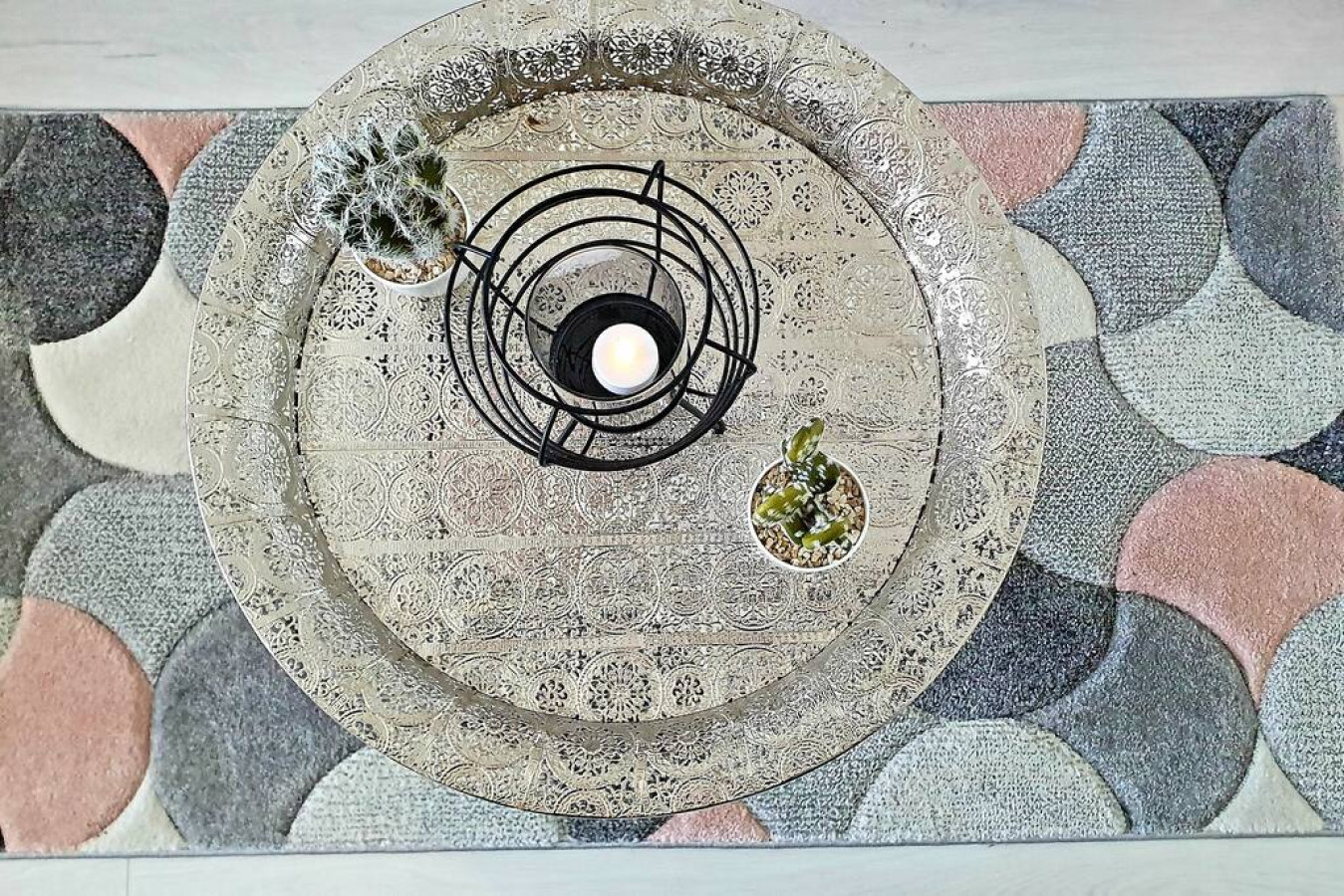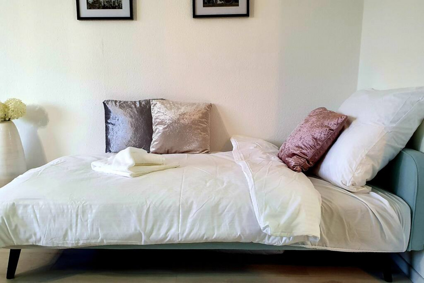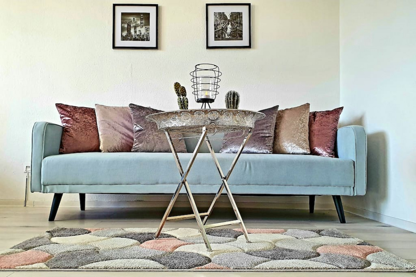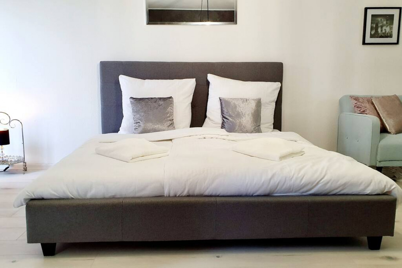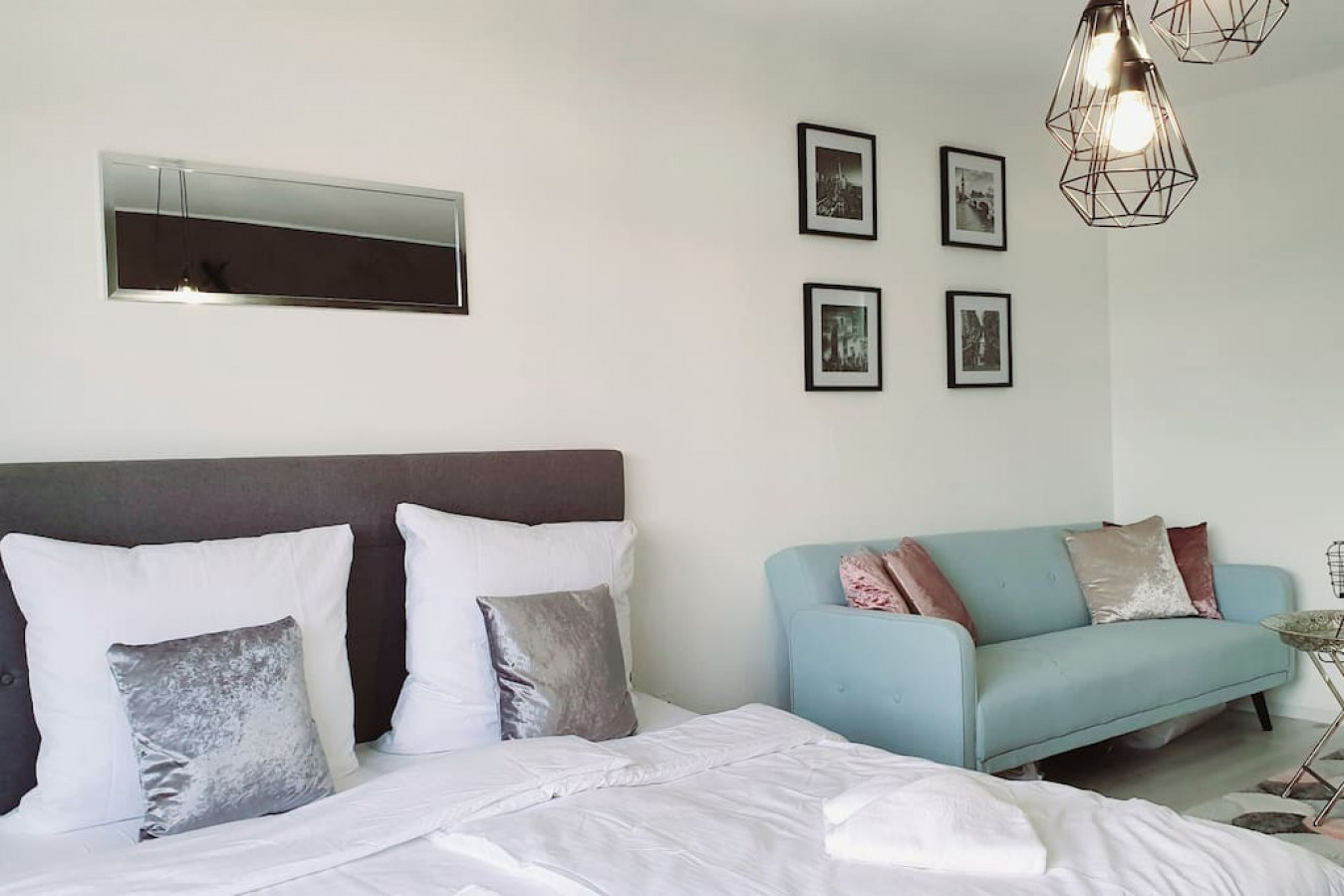 Der elegante Wohn- und Schlafbereich ist mit viel Charme und gemütlichen Farben in Hellblau, Rosa und Grau eingerichtet.