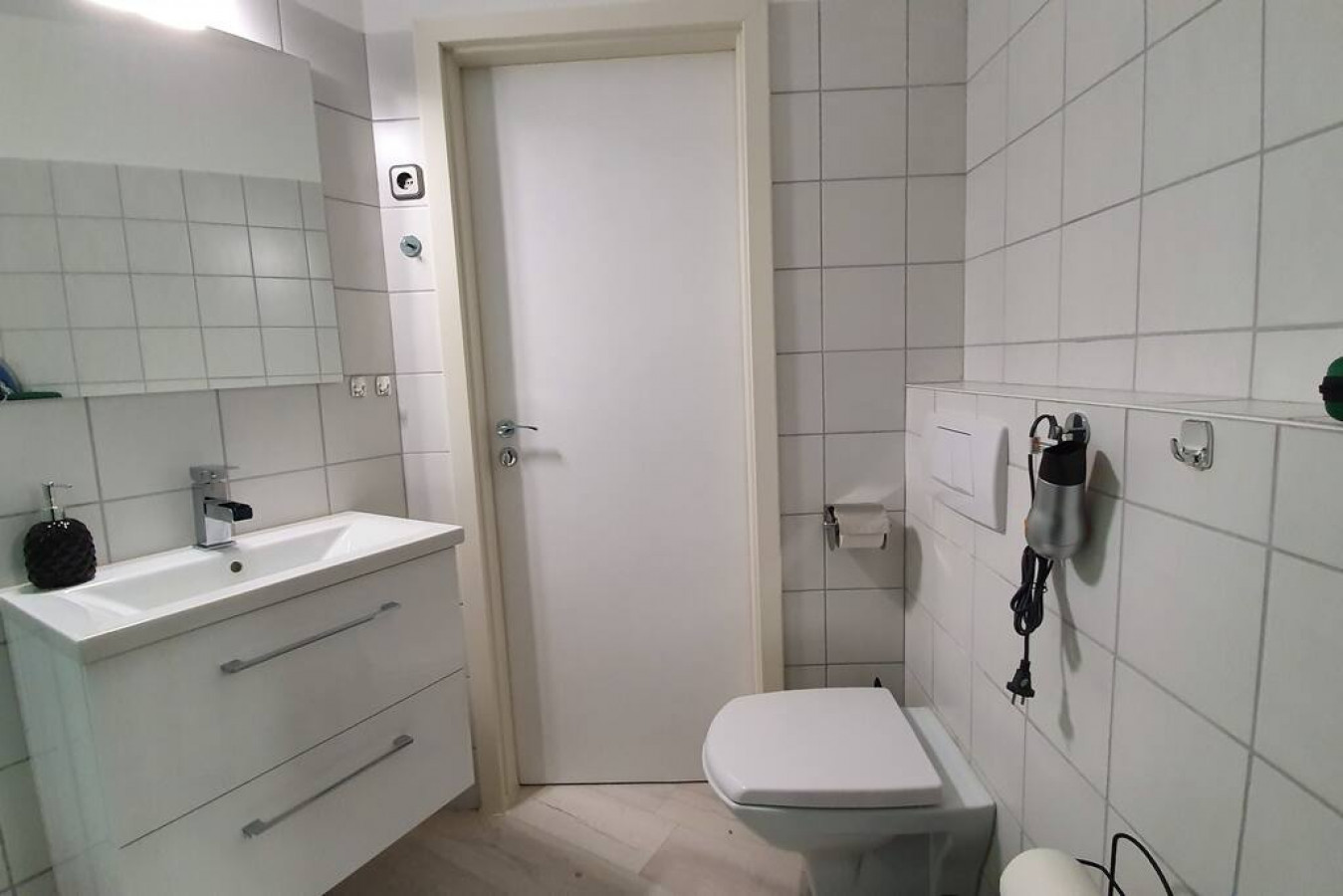 Das moderne Badezimmer mit Dusche ist mit Haartrockner, frischen Handtüchern, Duschgel und Shampoo ausgestattet.