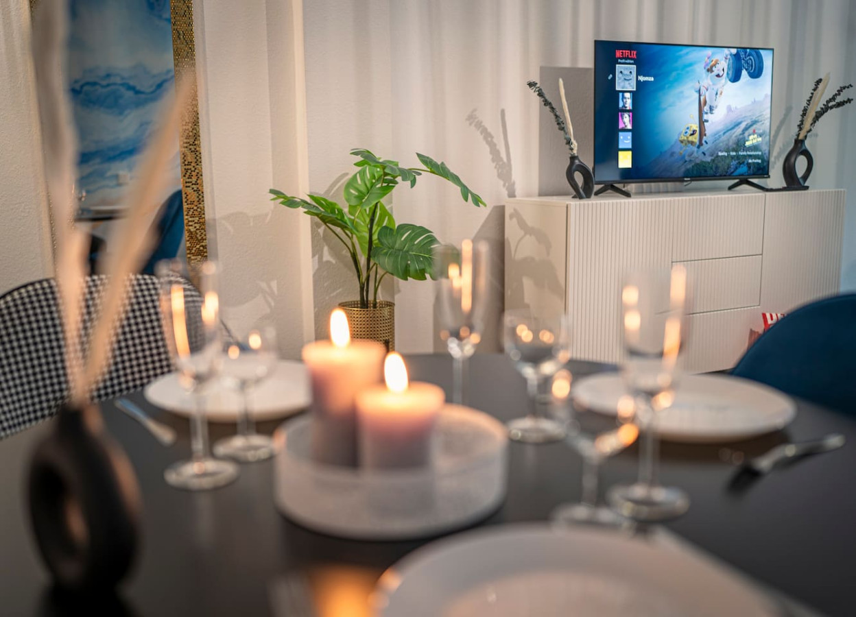 Die voll ausgestattete Küche lässt keine Wünsche offen und ermöglicht es dir, deine Lieblingsgerichte selbst zuzubereiten. Nach einem langen Tag kannst du dich in der gemütlichen Sitzecke vor dem Smart-TV entspannen und deine Lieblingsserien auf Netflix genießen. Für den perfekten Start in den Tag sorgt die NESPRESSO-Kaffeemaschine, die dir jederzeit aromatischen Kaffee bereitet.