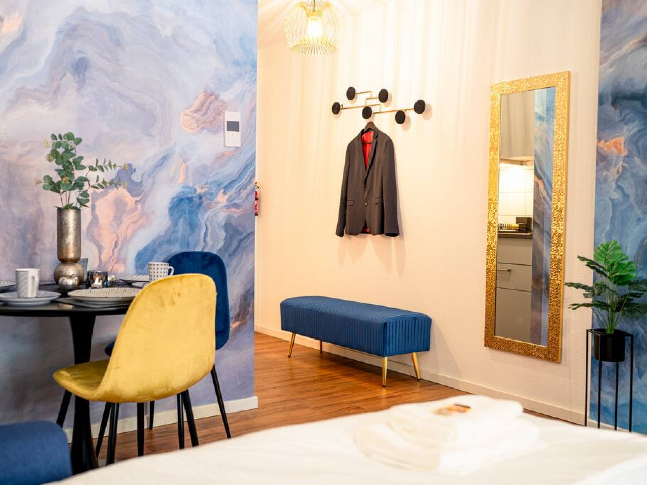 Du bekommst hochwertige Bettwäsche und Handtücher zur Verfügung gestellt. Außerdem erwartet dich ein Begrüßungsset mit Kaffee, Tee und Wasser.