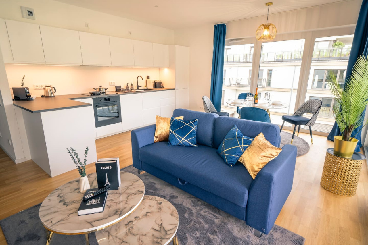 Das Schlafzimmer verfügt über ein bequemes Queensize-Bett. Im Wohnzimmer findest du eine gemütliche Schlafcouch, ideal für entspannte Abende oder zusätzliche Gäste.